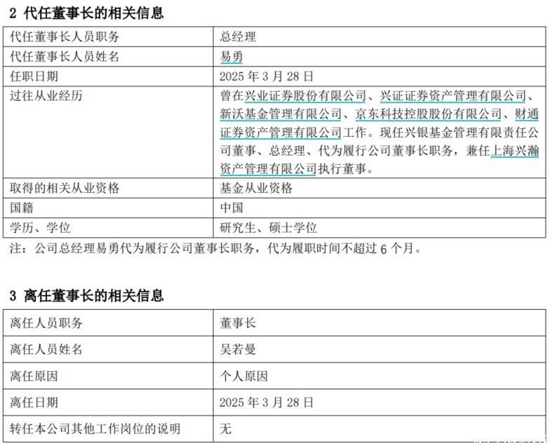 3月29日,兴银基金同时宣布,由公司现任总经理易勇代为履行董事长职务,代为履职时间不超过6个月。公开简历显示,易勇曾在兴业证券股份有限公司、兴证证券资产管理有限公司、新沃基金管理有限公司、京东科技控股股份有限公司、财通证券资产管理有限公司等金融机构工作,现任兴银基金董事、总经理,兼任上海兴瀚资产管理有限公司执行董事。